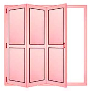 Sistema con ante pieghevoli ancorate orizzontalmente al telaio, che scivolano parallelamente ad esso grazie a carrucole di scorrimento.